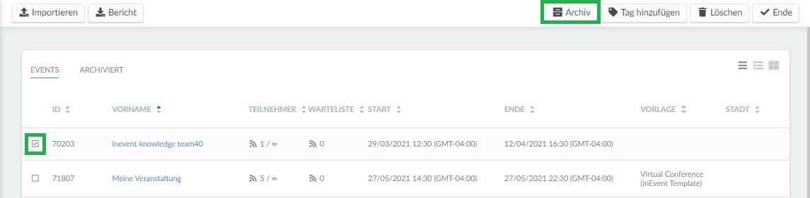 Um die archivierten Events anzuzeigen, klicken Sie einfach auf den Tab Archiviert.