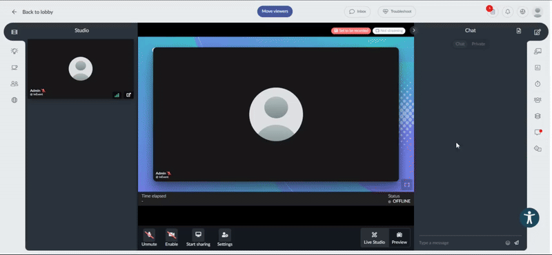 This feature is available in all room video modes, except the External Link which will direct users outside the InEvent platform.