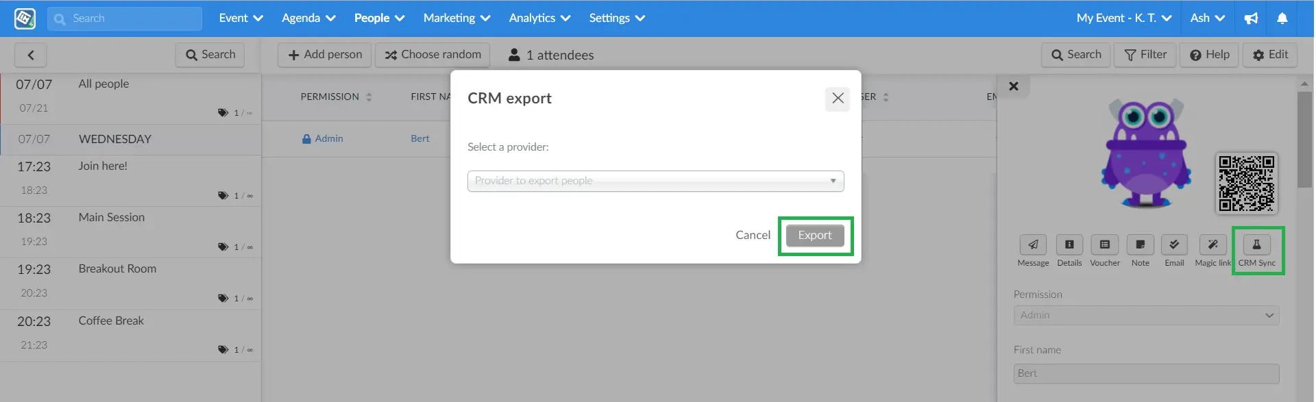 You can also export leads from InEvent to HubSpot, from the People > Attendees page. Simply choose an attendee by clicking on them. A window with this person’s details will appear. Click on Edit > CRM Sync. A new window will pop up and you should select HubSpot from the dropdown bar and press Export, as shown below: