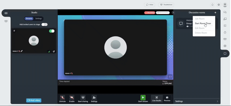 It is also possible to create the Discussion rooms inside the Live stream if you are an admin, room host, room co-host or staff, by following these steps: