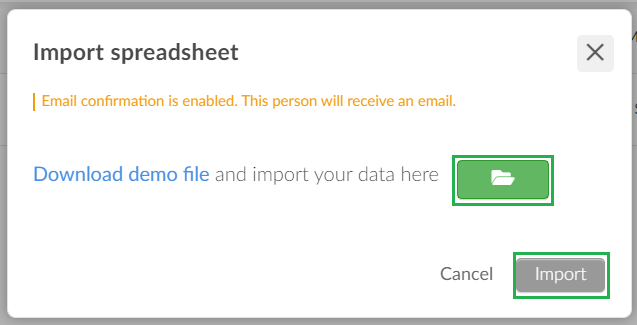 - Then, save the file and upload it to the platform by clicking on Import > Green File Icon > selecting your file > Import > End.