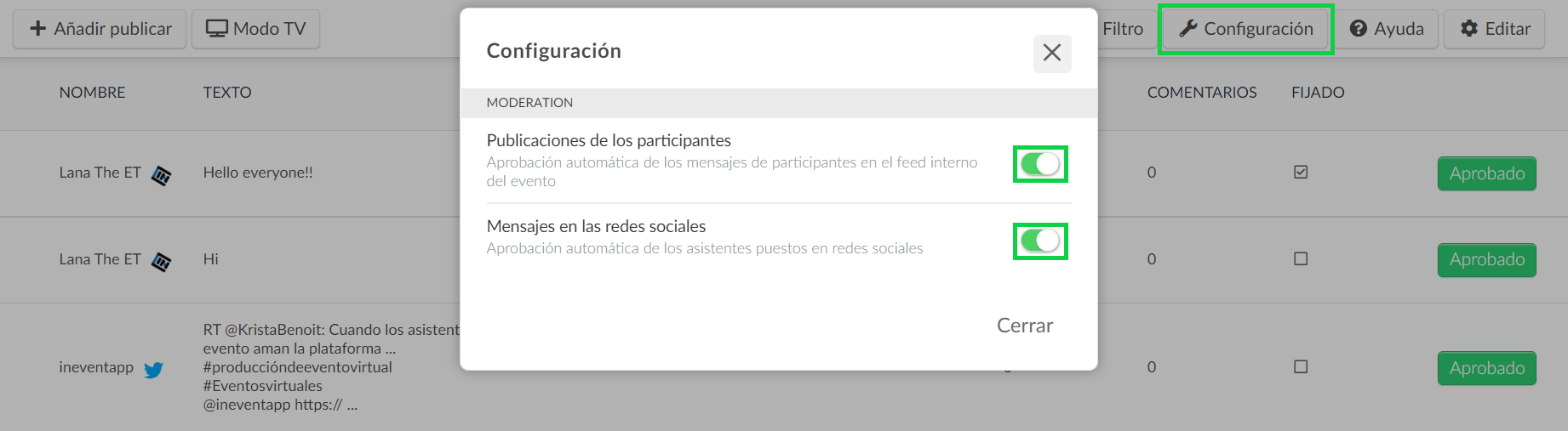 Puede habilitar la aprobación automática de las publicaciones de los participantes en el feed y las redes sociales sin salir de la página del feed. Para hacerlo, haga click en el botón Configuración. Esto activará una ventana emergente donde puede habilitar la aprobación automática de Publicaciones de los participantes y Mensajes en las redes sociales. Para habilitar estas opciones, mueva el interruptor como se muestra a continuación: