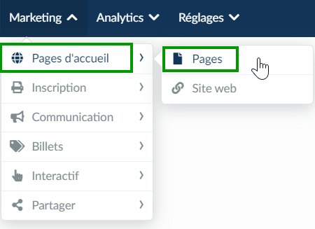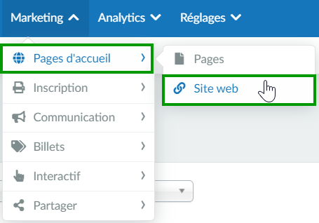 Les sites web sont des modèles prêts à l'emploi disponibles sur la plateforme. Pour que le domaine soit appliqué à votre site web, il est nécessaire que l'outil de page de destination soit désactivé dans les outils d'événement.